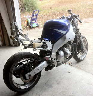I'm really diggin' the stance it has at the moment and have started to figure out how the rest of the tail will be finished. With some more square tubing I'll give it more dimmension and aggresive lines and then the stock electrics and fender plastic whatever-it's-called will be cut down and re-installed, keeping it somewhat stock. The seat height will also remain the same so riding will be like it was as if it came out the factory, minus all the bodywork.